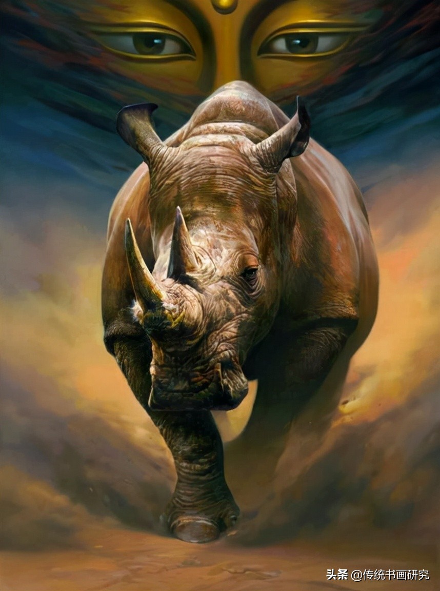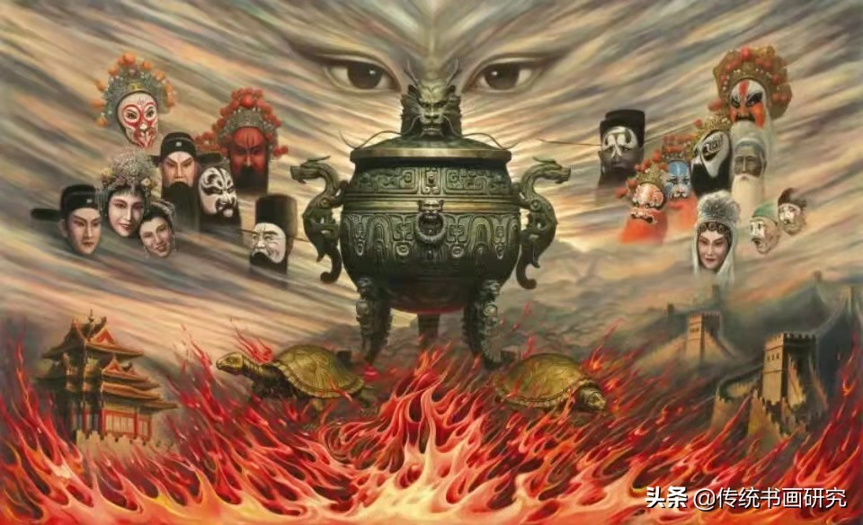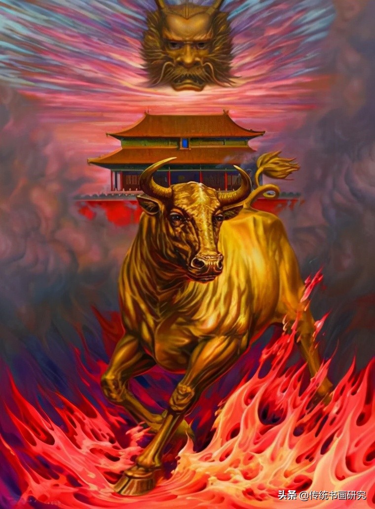 吴欢的《天眼》既有消除陈规旧俗的一面,又有上述两种因素存在。他用道释之佛像、菩萨、文学里的神话、戏曲人物代天理而言,大小精微地赋予了自然万物中的飞潜动植如牛马、鹰鹭、鹤、羊、龙虎、林木花草、水际云烟等的万变无束与持久性。有意思的是,他画里所强调的物事,总是金面铜身,配以烈火云烟和海市蜃楼般的幻境(宫殿、长城、带有龙饰的青铜),似乎在说明一种是非曲折的历史观。