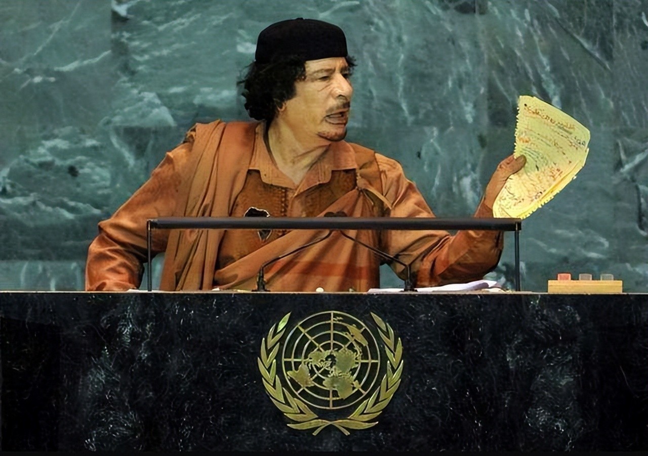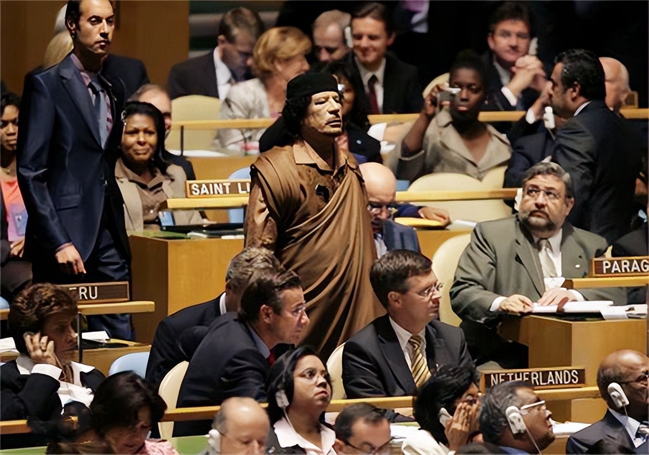 他有多能讲呢,当时联合国给每个国家发言人的演讲时间是15分钟,结果卡扎菲上台后,稿子一丢开始自主发挥,滔滔不绝地讲了100分钟,把口译人员都给折腾崩溃了。