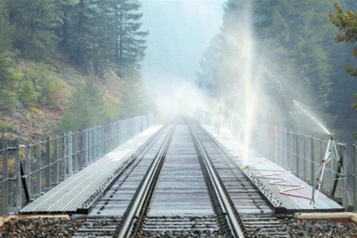 2021年7月28日,在美国加利福尼亚州“迪克西”山火的过火地带,人们架设喷淋装置为铁轨降温。新华社/路透