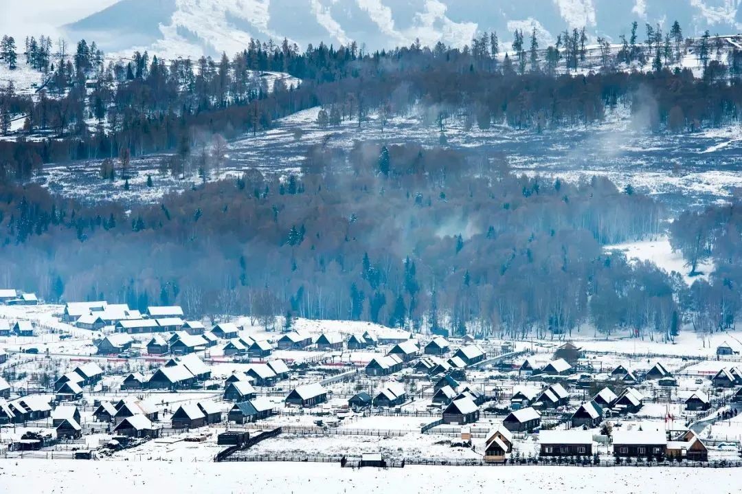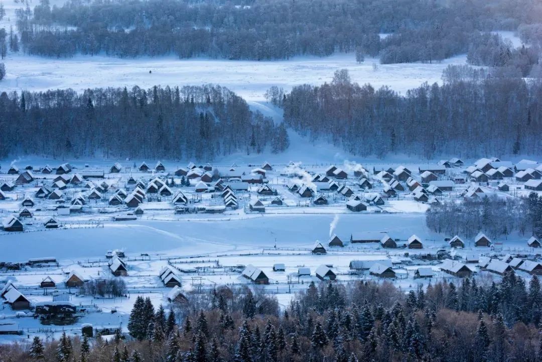 禾木村被很多人誉为最美村庄,冬天的禾木被白雪覆盖,远山薄雾轻绕,让人想起了《雪山飞狐》里的场景。