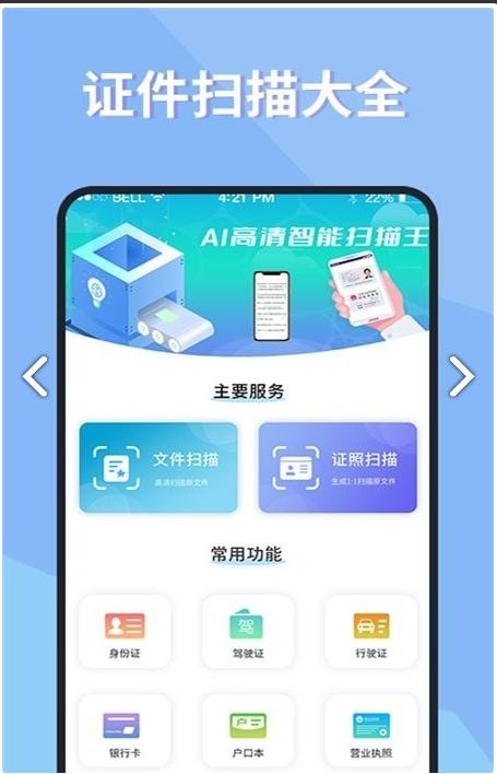 证件扫描仪是一款能够批量扫描文档、文字识别、excel表格识别、身份证、护照、书本、报纸、名片、PDF、手稿、图片转文字识别和拍照翻译的OCR全能扫描手机软件,同时也是您的全能扫描王。