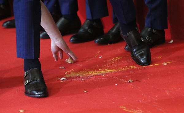 就在足协主席郑梦奎讲话时,有球迷向他们投掷了第一个鸡蛋,随后又有鸡蛋和五到六个抱枕被扔来上来。其中,一枚鸡蛋差点砸中孙兴慜的腿部,后者曾在本届世界杯打入2球。