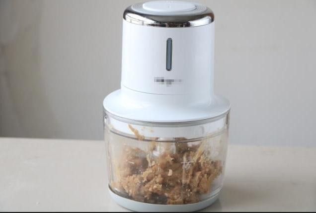 将买回来的猪里脊肉处理干净,先用刀切成较小的块,再放入绞肉机中,搅成细腻的肉泥。