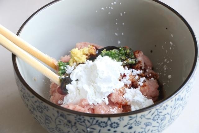 将鸡蛋的蛋黄和蛋清分开,将蛋清、香葱末、生姜末、蚝油、酱油、老抽、食盐、淀粉依次加到肉泥中。