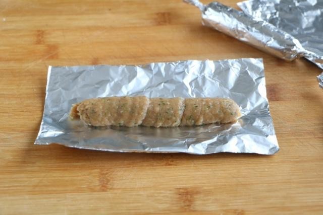 将香肠肉馅用锡纸紧紧的包裹住,再把锡纸的两头用力拧紧,放在蒸锅中隔水蒸制25分钟。