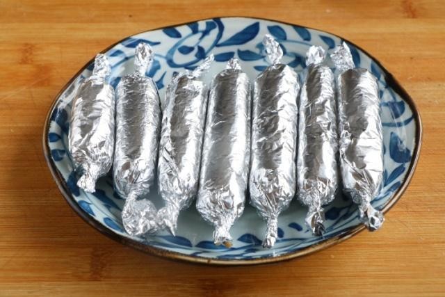 3、用锡纸包裹的香肠做法快捷,也可以购买现成的肠衣,相对来说步骤更为复杂一些,但是风味更好。