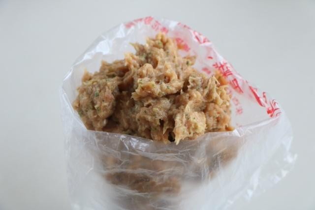 沿顺时针方向,用力搅拌肉馅,直到肉馅搅拌均匀上劲,再装入干净的裱花袋中,把裱花袋头剪出一个大小合适的口。