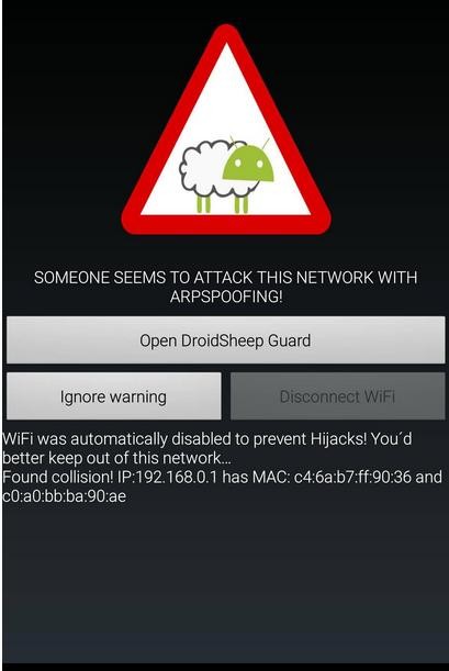 DroidSheep Guard,该应用的另一个版本,能够帮助大家在网络之上检测各类ARP嗅探活动——包括由FaceNiff、Droidsheep以及其它软件实施的功能活动。