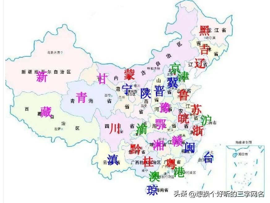 海内台北上渝天(海南,内蒙古,台湾,北京,上海,重庆,天津)。