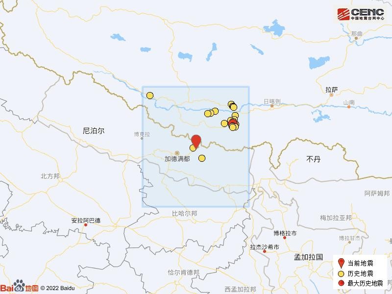 根据中国地震台网速报目录,震中周边200公里内近5年来发生3级以上地震共23次,最大地震是2020年3月20日在西藏日喀则市定日县发生的5.9级地震(距离本次震中156公里),历史地震分布如图。