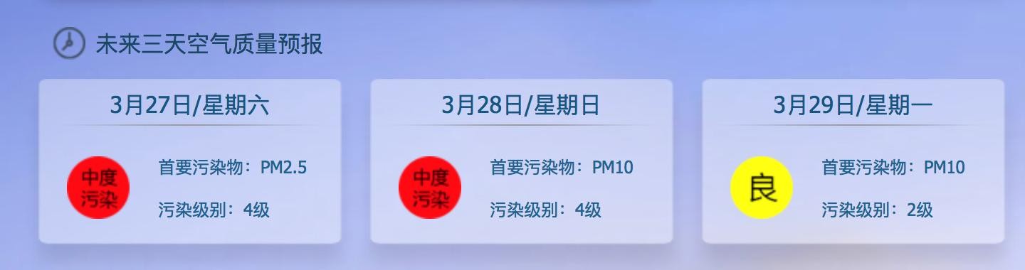 根据北京市生态环境监测中心的预报,今天白天,北京高湿静稳、扩散条件不利,预计首要污染物为PM2.5,空气质量指数130-150,为3级轻度污染。3月27日至28日,本市PM2.5浓度将进一步升高,预计空气质量为4级中度污染。