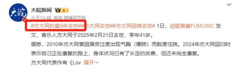 近日,知名歌手方大同的去世,再一次震惊娱乐圈。