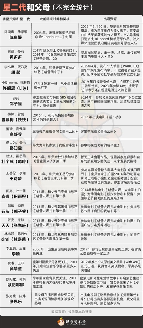 先天的家庭资源就像一条已经铺好的进圈通道。父母的名气、行业人脉和观众基础,让他们节省了许多别人必须经历的“打怪升级”过程,也让他们的出现显得“理所当然”。