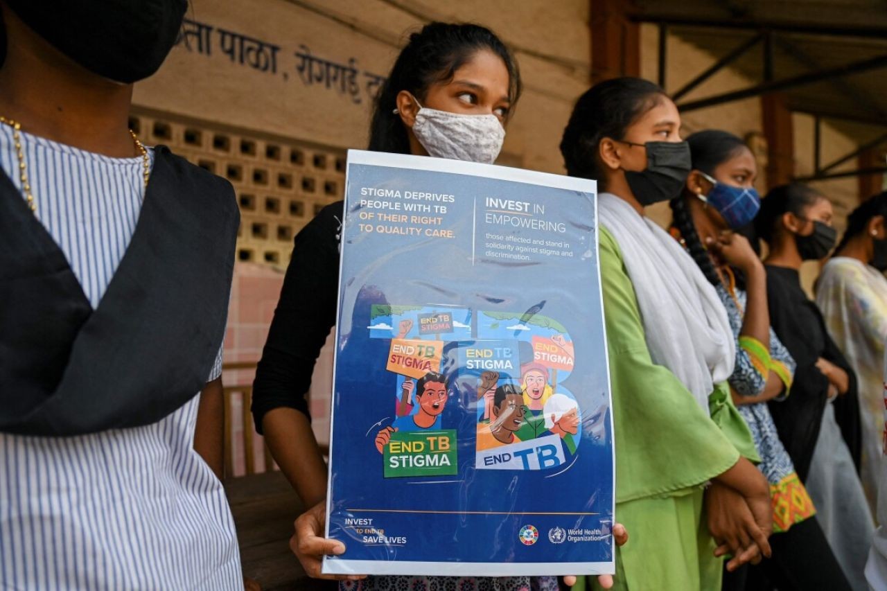 当地时间2022年3月23日,印度孟买,在达拉维贫民窟的一所学校,一名女学生手持海报,并观看卫生工作者的街头表演,该表演旨在提高人们对结核病的认识。(图/视觉中国)