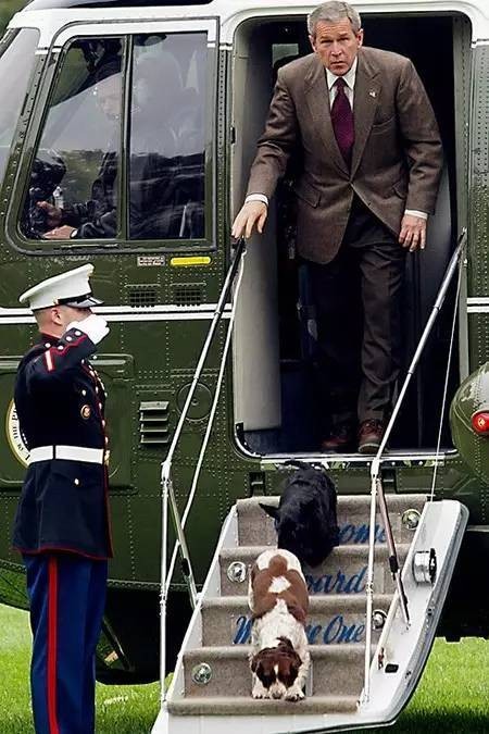 小布什的宠物狗“点点”(前)和“巴尼”抢先跑下总统专用直升机“海军陆战队一号”。