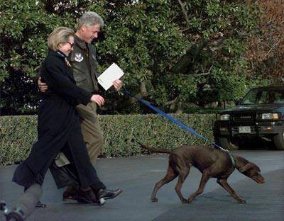 克林顿和夫人希拉里牵着宠物狗“巴迪”走出白宫。