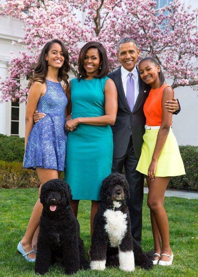 奥巴马一家与宠物狗“波”和“阳光”(毛色黑白相间)在白宫的合影。