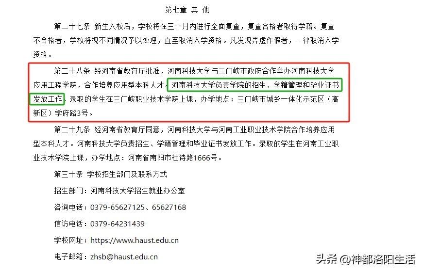 基于这种信息,做出推理,预测河南科技大学的应用工程学院,预计到2025年的7月差不多就能批复了。可能会改名为河南应用工程学院,孩子上了这个大学,肯定会有一定的影响,于是我去翻了翻河南科技大学的招生网站,看到2024年的招生公示信息里有一条写到:“河南科技大学与三门峡市政府合作举办河南科技大学应用工程学院,合作培养应用型本科人才。河南科技大学负责学院的招生、学籍管理和毕业证书发放工作。”