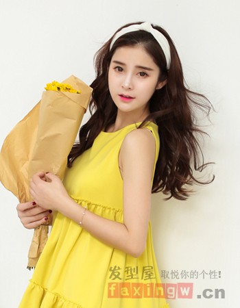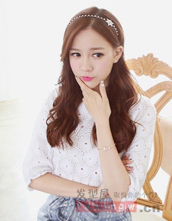 以清新低调的深棕色染发颜色为主,再搭配中分的露额发型将女生精致的鹅蛋脸完美的呈现出来,而精致的发箍与长卷发的搭配最显青春少女风了。