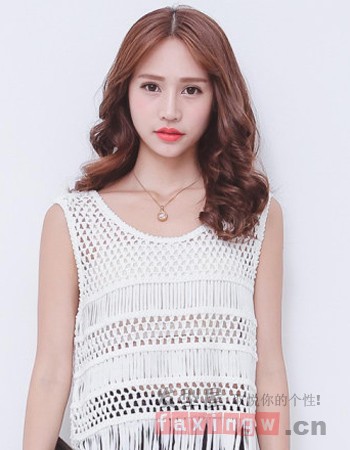 一款很显小女生的活泼可爱感的时尚中分发型图片,以浅棕色的染发颜色为主,搭配中分形式的丰盈中长卷发相搭更显活泼可爱风。