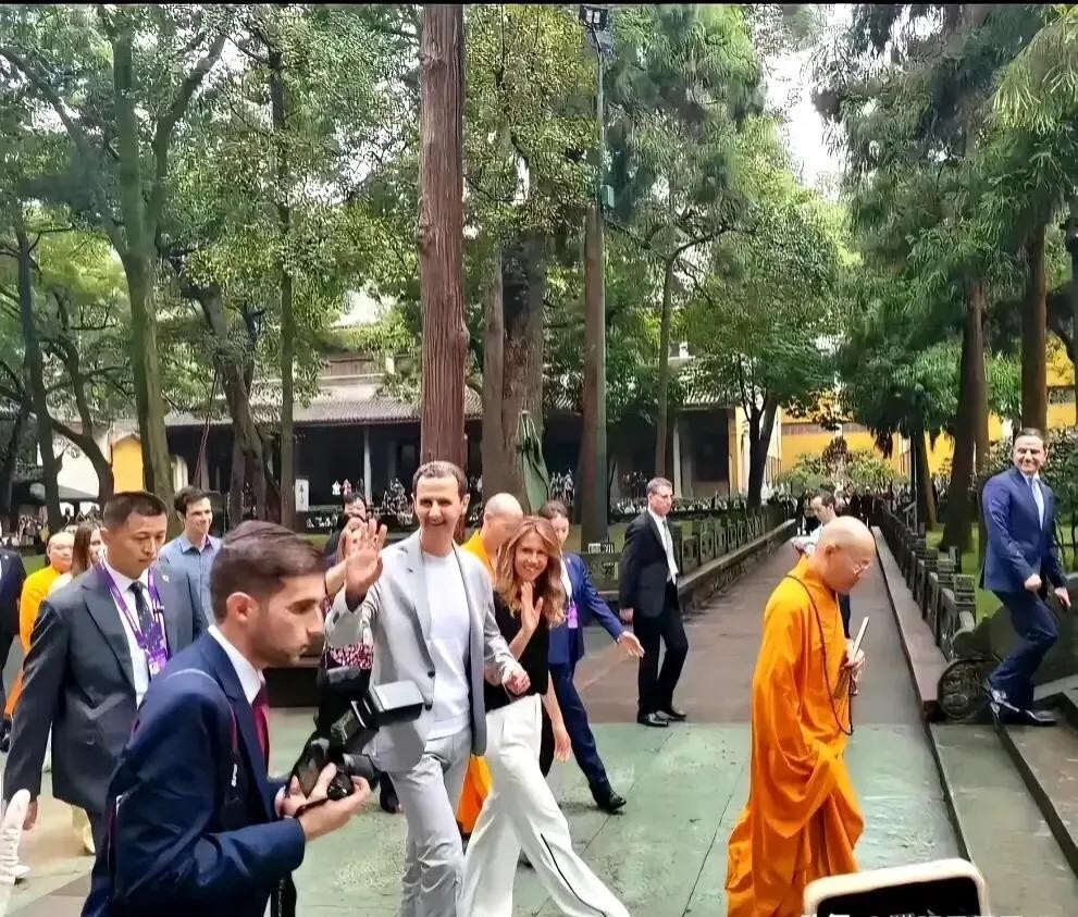 据报道,当巴沙尔阿萨德夫妇抵达灵隐寺时,中门大开,一条红地毯直通大雄宝殿。方丈身着盛装,带领僧侣们整齐列队,以热烈的欢迎姿态迎接这位叙利亚总统。巴沙尔阿萨德和夫人休闲打扮,神情轻松,频频向游客挥手致意,显得非常亲切和友善。