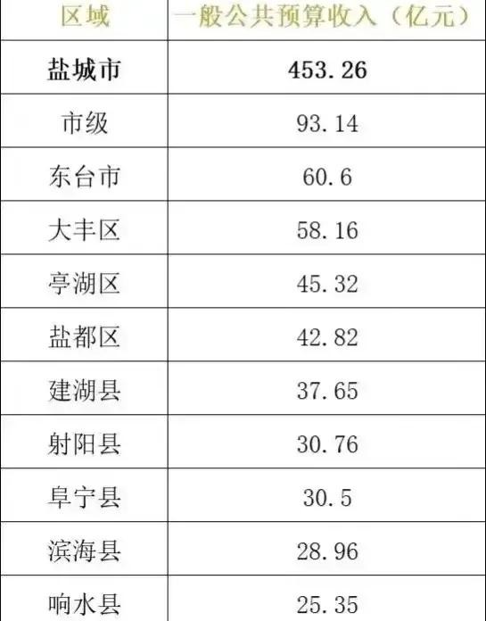 盐城各区县财政收入:大丰区接近东台市,建湖县第5,响水县最后