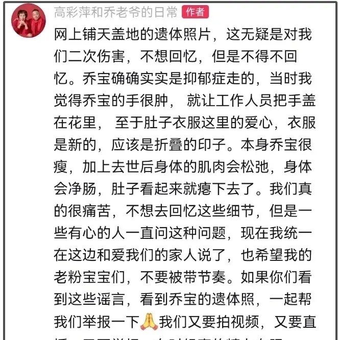 乔爸乔妈,两位老人本来就够不容易的了,白发人送黑发人,这伤疤还没好呢,又被这些谣言撒了一把盐,你说这叫什么事儿?他们都出来辟谣了,说kimi是抑郁症走的,那些照片上的“疑点”都是被恶意解读的。唉,可怜天下父母心啊!