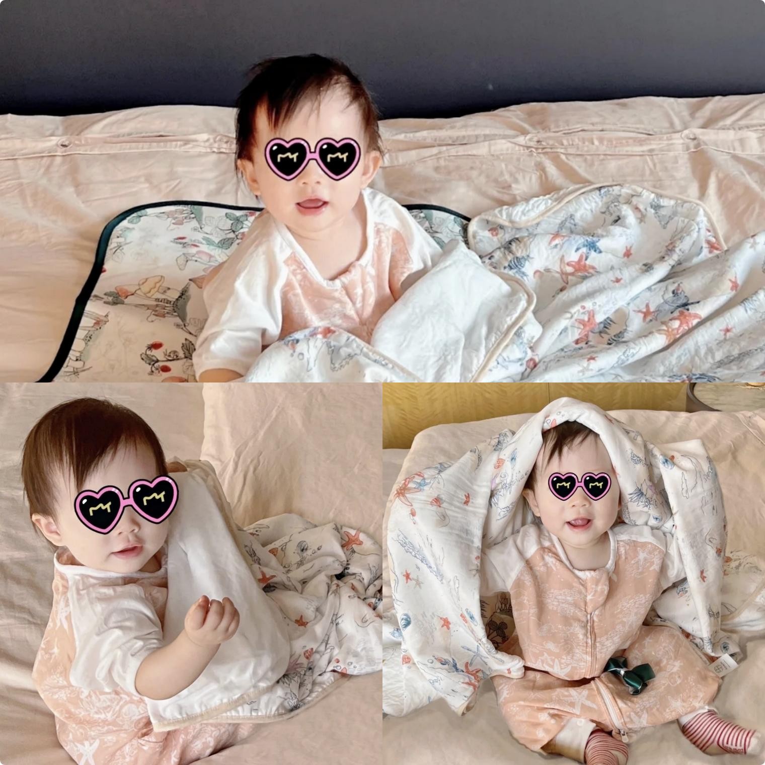 小蛋饺又换了一套睡袋,粉粉嫩嫩的更可爱了,每一张照片都拍得很萌,镜头感十足,估计将来有拍戏的潜力。