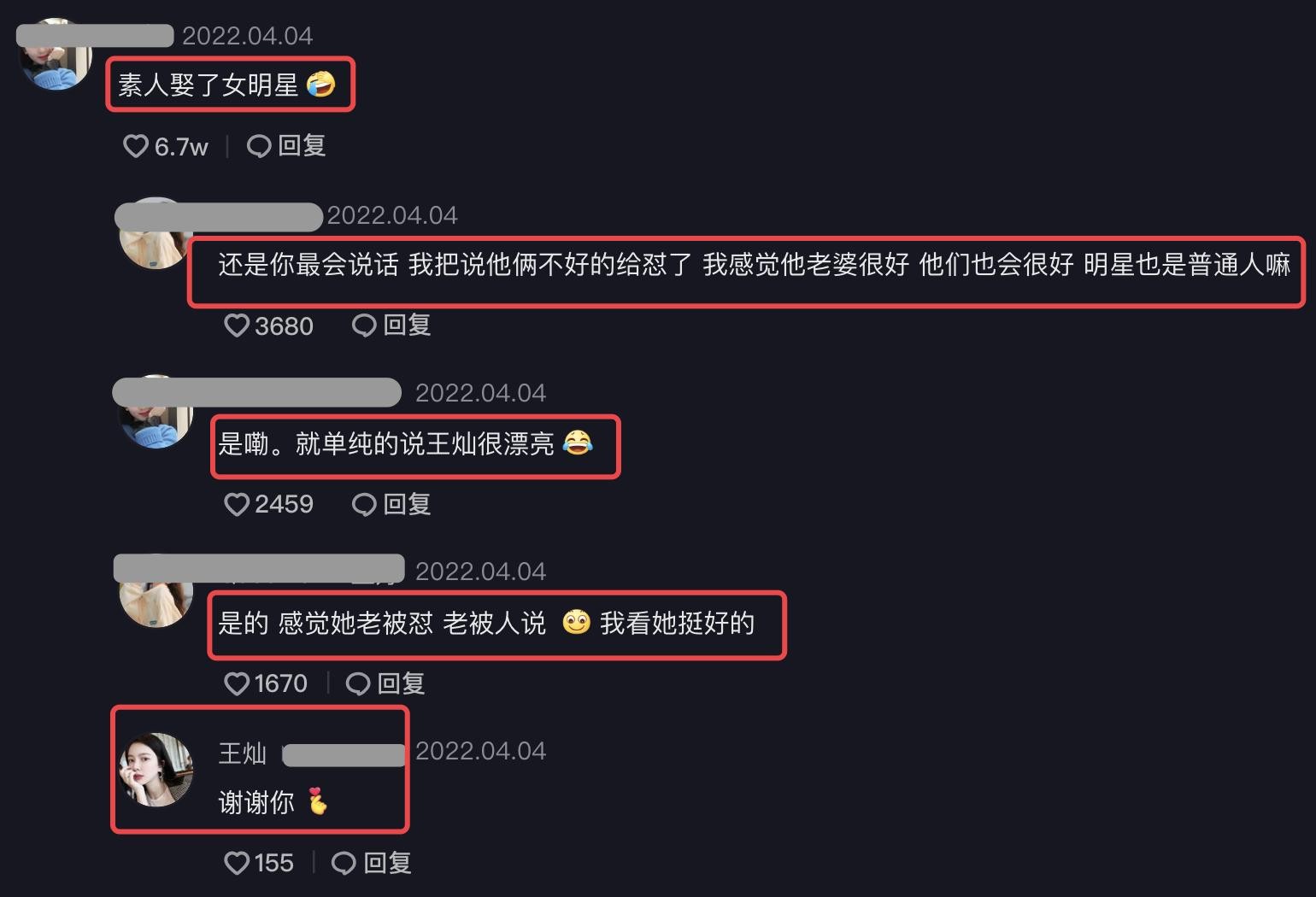 不过不少网友认为王灿太漂亮,丝毫不输女明星,气质也十分在线,于是笑称杜淳才是素人。王灿看到大家都这么赞美自己,还留言感谢大家。