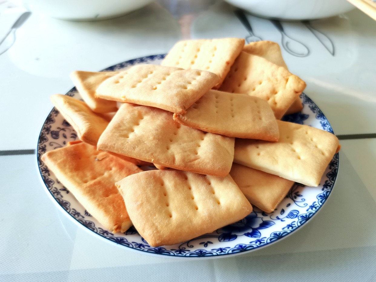 8、时间到,香喷喷的酥香饼干出炉了,拿一个吃,酥香美味,比买的饼干好吃很多,关键是自己烤的饼干放心无添加,多吃几块也不担心健康问题。
