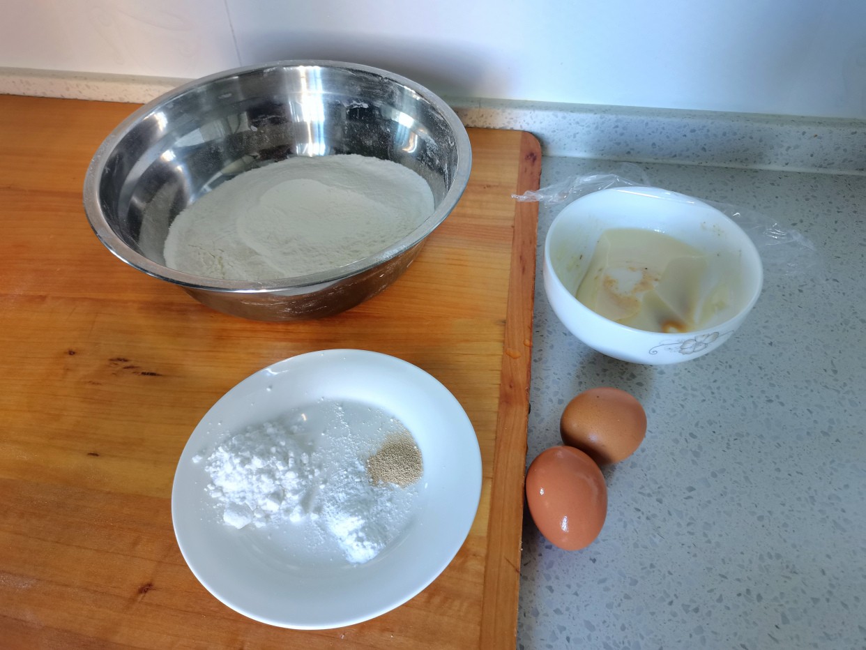 普通面粉250克,牛油10克,鸡蛋2个,冰糖粉5克,泡打粉1克,发酵粉0.5克,把上面食材全部放入面盆里面。