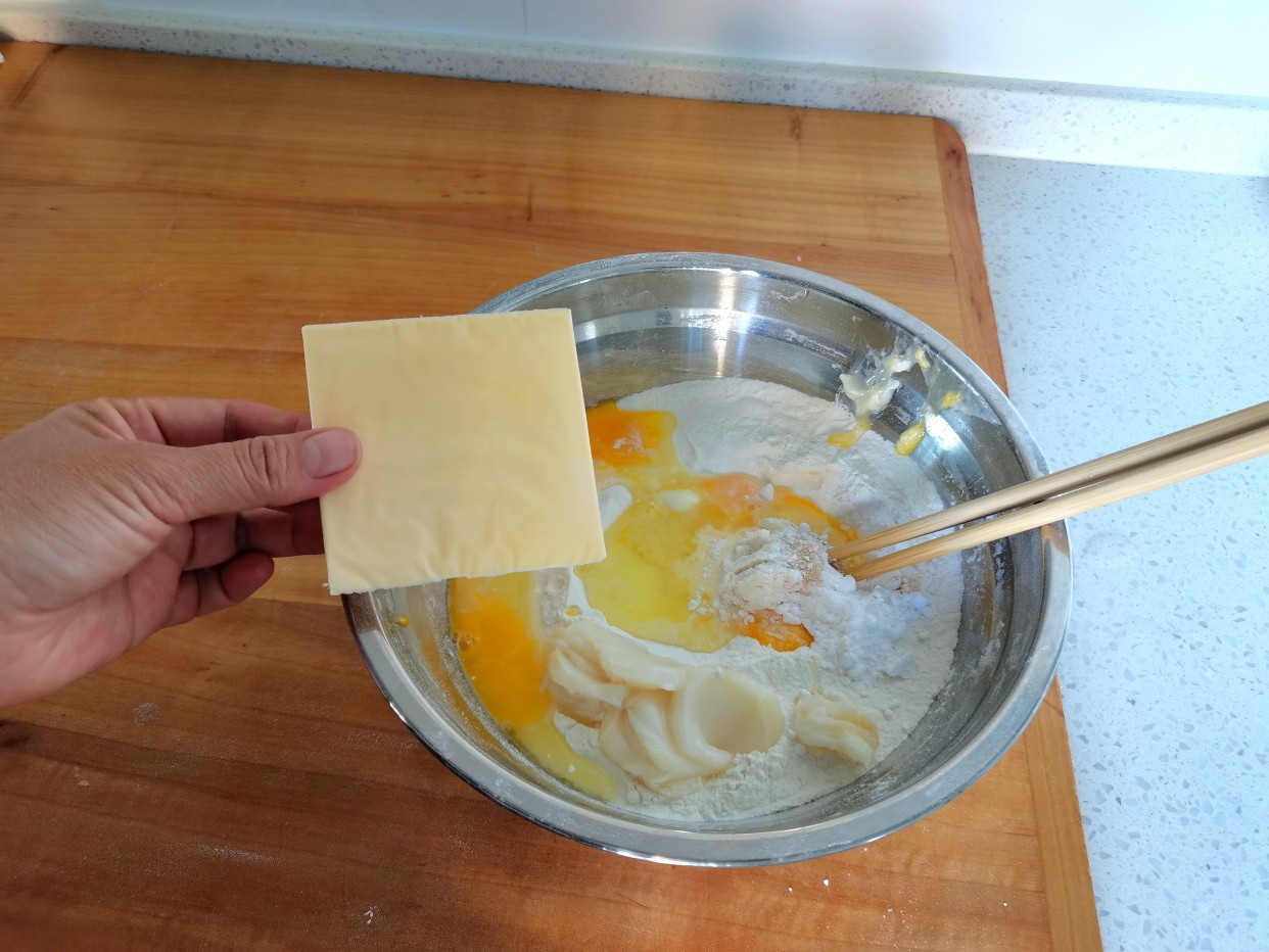 4、为了增加奶香味,又放了一片芝士,然后用适量牛奶和面。