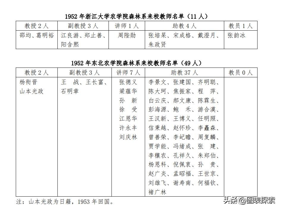 根据1952年东北林学院成立时的师资力量,教授和副教授级别其实浙江大学和东北农学院都是2人和3人,但是讲师和助教的人数上,毫无疑问是东北农学院占据绝对上风。毕竟从温暖的南方来到东北,浙江大学森林系很多的人才也是有畏难情绪,应该没有全部过来。所以,总体来看还是东北农学院在东北林学院筹建的起的作用更大一些。