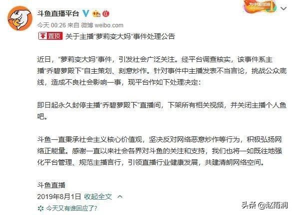 斗鱼直播公告:近日,“萝莉变大妈“事件,引发社会广泛关注。经平台调查核实,该事件系主播“乔碧萝殿下”自主策划、刻意炒作。针对事件中主播发表不当言论,挑战公众底线,造成不良社会影响一事,现平台作如下处理决定:即日起永久封停主播“乔碧萝殿下”直播间,下架所有相关视频,并关闭主播个人鱼吧。