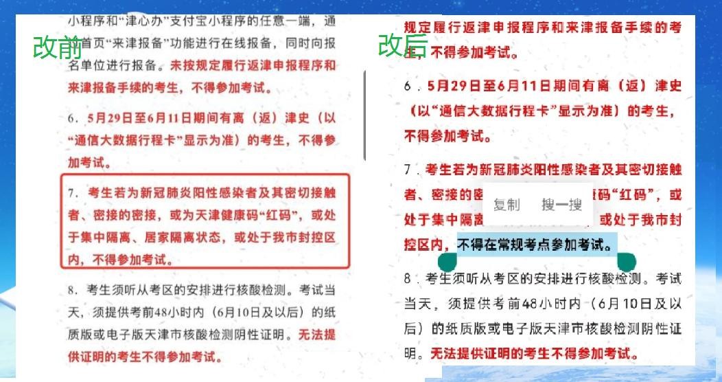 原定于3月19日进行的天津市春季高考,再次推迟,定于6月12日开考,但通知中却由于疏忽,将阳性考生写为不得参加考试。立刻引起了家长广泛的议论。