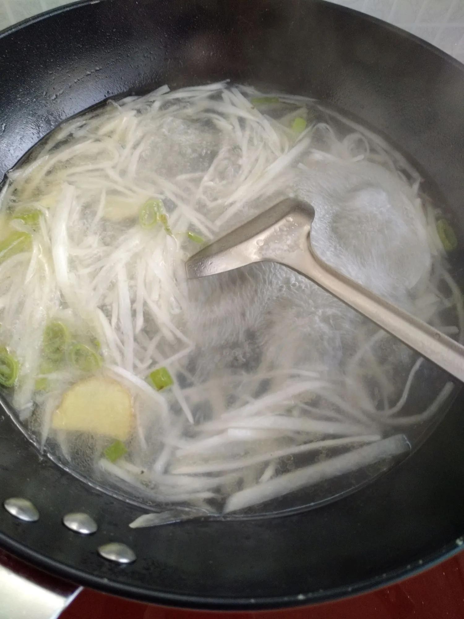 3.锅中油开,下入葱姜末炒香,然后下入白萝卜丝翻炒一会儿。加入适量清水,大火烧开。