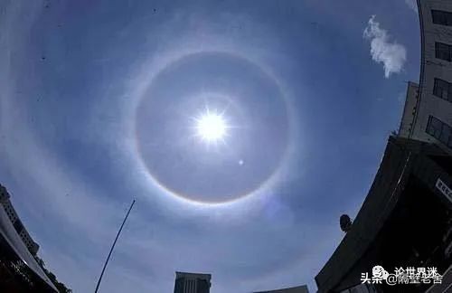在民间被称为“风圈”,它是有阳光或月光在云层中的冰晶上反射和折射而形成的,形成于距离地面6-7公里以上的高度,我们可以看到有小冰晶组成的乳白色丝质薄云,它的正式名称是“卷层云”,组成这种云的小冰晶就像棱镜一样,当太阳光或月光照在它们上面时,会产生反射和折射,倘若角度合适将形成多彩的颜色或白色光圈、光弧、光斑或者是假日,这些都统一称之为“晕”,一般情况下太阳或月亮周围是只有一圈晕圈的,但是偶尔也会因为某种原因形成环环相套的多个晕圈,从而也就形成了多个太阳同时出现在空中的情况.