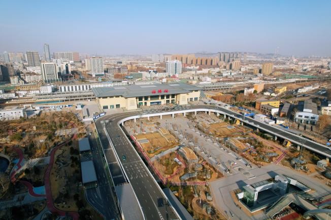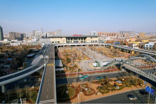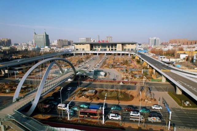 1月7日,淄博火车站,无人机航拍站前广场客流。火车站上人来人往,拎着大包小包的乘客匆匆赶往候车室等待检票,期盼踏上归乡的列车。