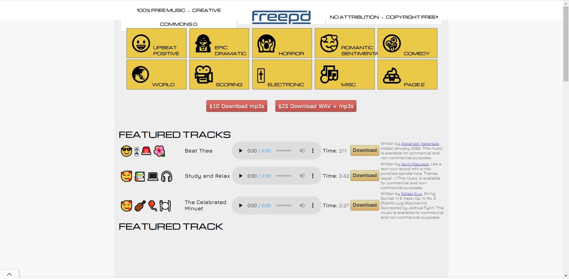 公共领域音乐资源网站(公有领域的作品由于没有专属权利人,因此公众有权自由使用它们,即CC0协议)网站可以单独下载任意一首音乐,也可以花10美元一键下载全站800多首MP3格式音乐,再加15美元可额外下载100多首wav格式音乐。