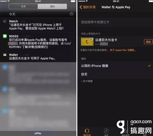 银行卡添加完毕后,稍等片刻 iPhone 会推送提示是否将卡片用于 Apple Watch;如果万一没收到推送,也可以自行打开 Watch 应用找到「Wallet 与 Apple Pay」自行添加。