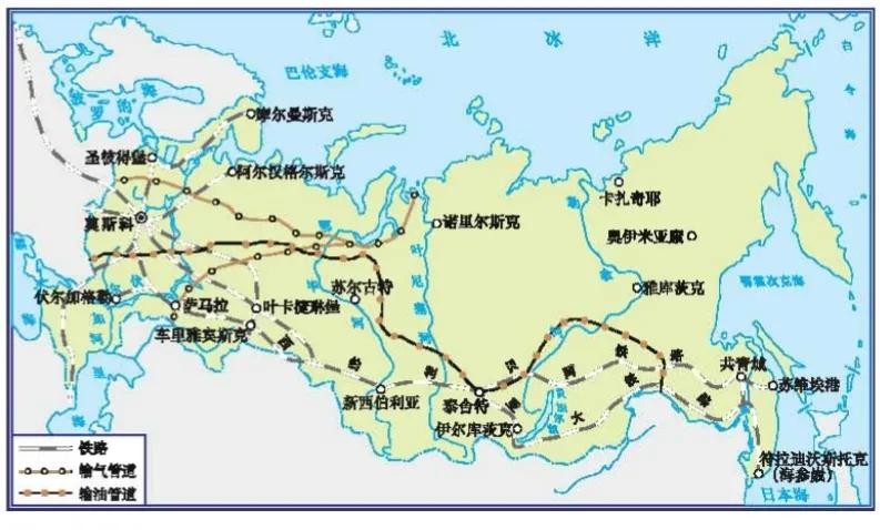 最后再其铁路交通分布上由于俄罗斯处于高纬度地区,其面临的河流冰冻期长,汛期短。只有自己的母亲河伏尔加河少数河流运输量大,所以交通以铁路为主。在亚洲部分。尤其是南部的贝阿铁路和西部利亚大铁路。特别是这个西部利亚大铁路从海参崴到莫斯科的铁路线,被称呼为“亚欧大陆第一桥”。