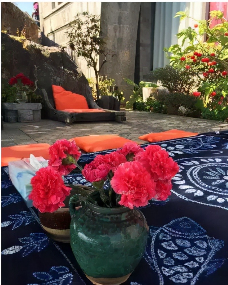 屋内都是原木家具,复古的茶几,充满白族民族特色的扎染家居用品,