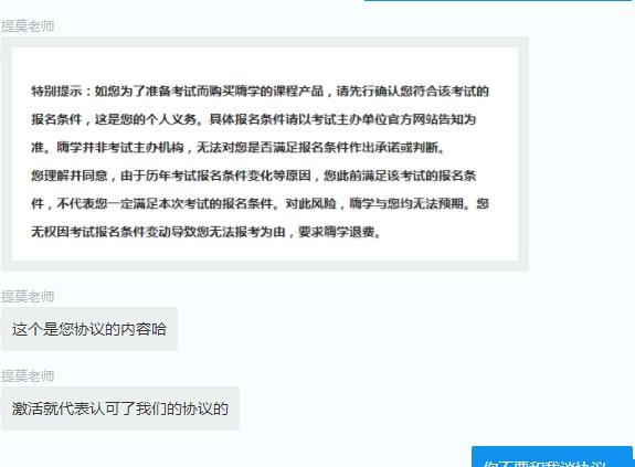 袁学员提供的截图显示,协议称“先行确认您符合该考试的报名条件,这是您的个人义务。具体报名条件请以考试主办单位官方网站告知为准。嗨学并非考试主办机构,无法对您是否满足报名条件作出承诺或判断。您理解并同意,由于历年考试报名条件变化等原因,您此前满足该考试的报名条件,不代表您一定满足本次考试的报名条件。对此风险,嗨学与您均无法预期。您无权因考试报名条件变动导致您无法报考为由,要求嗨学退费。”
