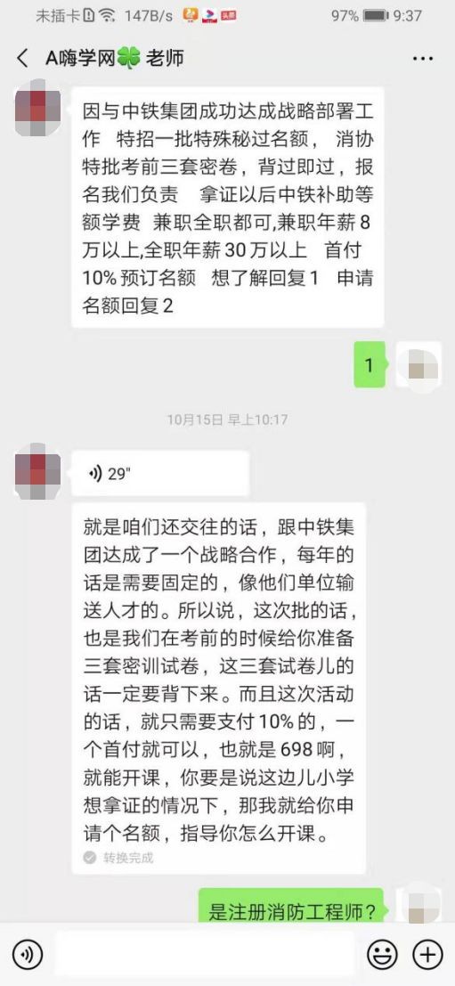 今年10月15日,微信网名为A嗨学网老师的销售人员联系伍学员,称“因与中铁集团成功达成战略部署工作,特招一批特殊秘过名额,消协特批考前三套密卷,背过即过,报名我们负责,拿证以后中铁补助等额学费,兼职全职都可,兼职年薪8万以上,全职年薪30万以上,首付10%预订名额”。