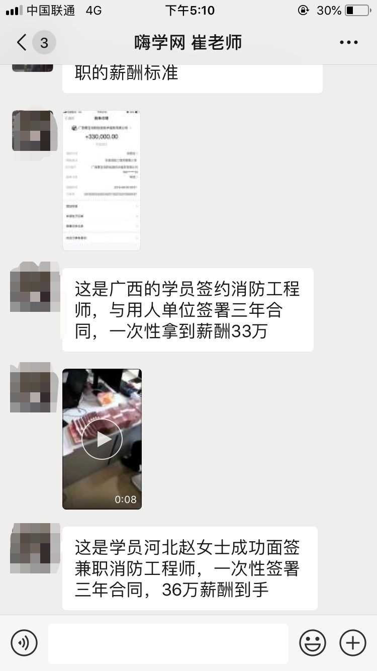 此外,嗨学网崔老师还向周学员发送了一张“各个省份消防工作师兼职的薪酬标准”的图片,一张收款33万的图片,以及一个封面为多叠人民币的小视频,称“广西学员与用人单位签署三年合约,一次性拿到薪酬33万元”,“河北赵女士一次性签署三年合同,36万薪酬到手。”