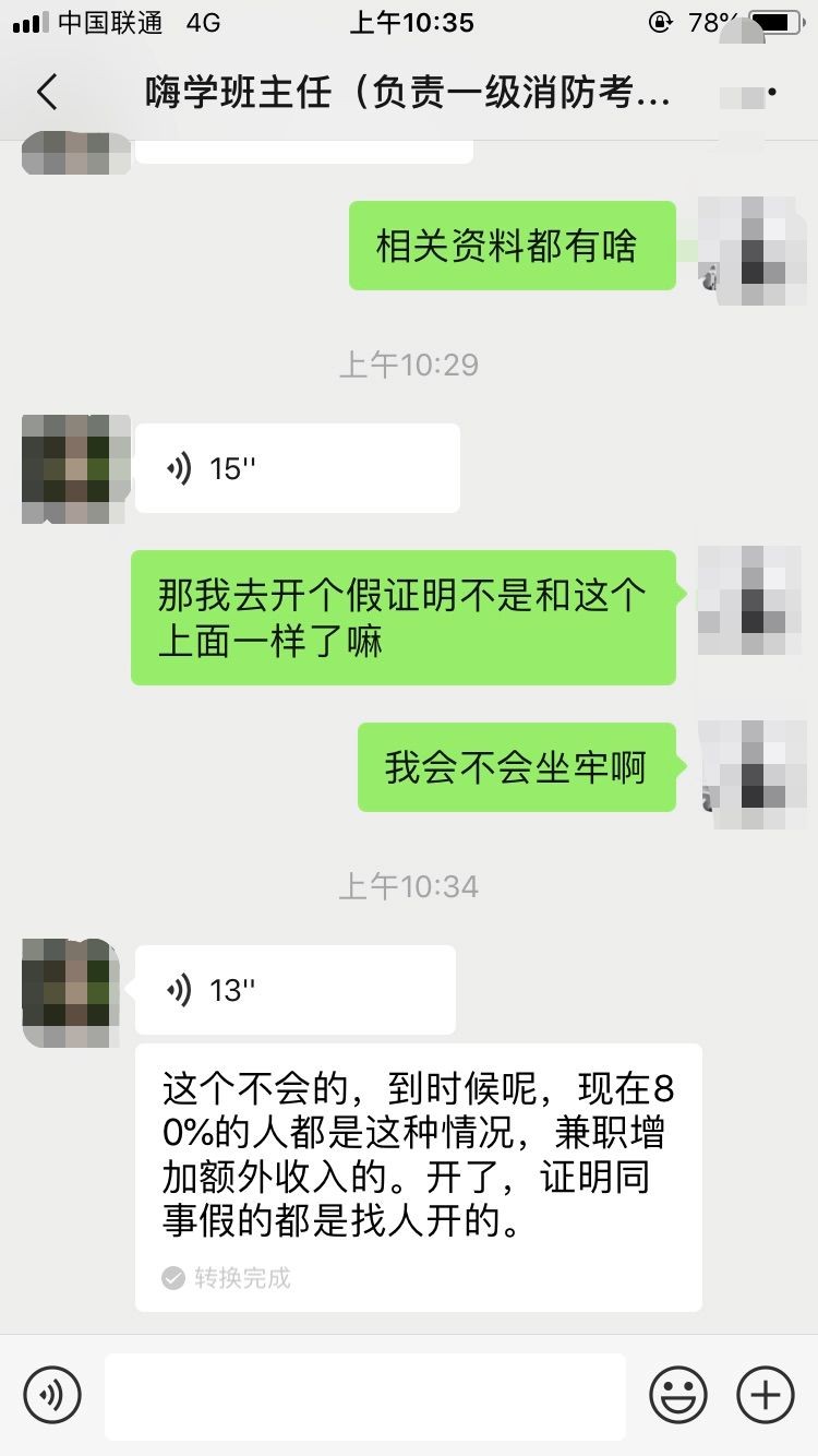 周学员还特别提到,在此之前,嗨学网的一个班主任还联系自己,说需开取一份从事8年以上的假的消防工作证明。“我问对方开假证明会不会坐牢,对方称‘不会的,现在80%的人都是这种情况,兼职增加额外收入,证明都是找人开的’”。