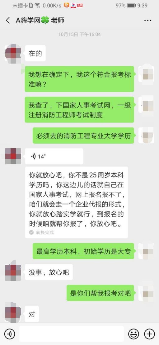 伍学员告诉记者,“我明确告诉嗨学网老师自己查了国家人事考试网,发现必须是消防工程专业大学学历且有相关年限工作经验者才能报名。对方告诉我在国家人事考试网报不了名,他们会走一个企业代报的形式,叫我放心。”