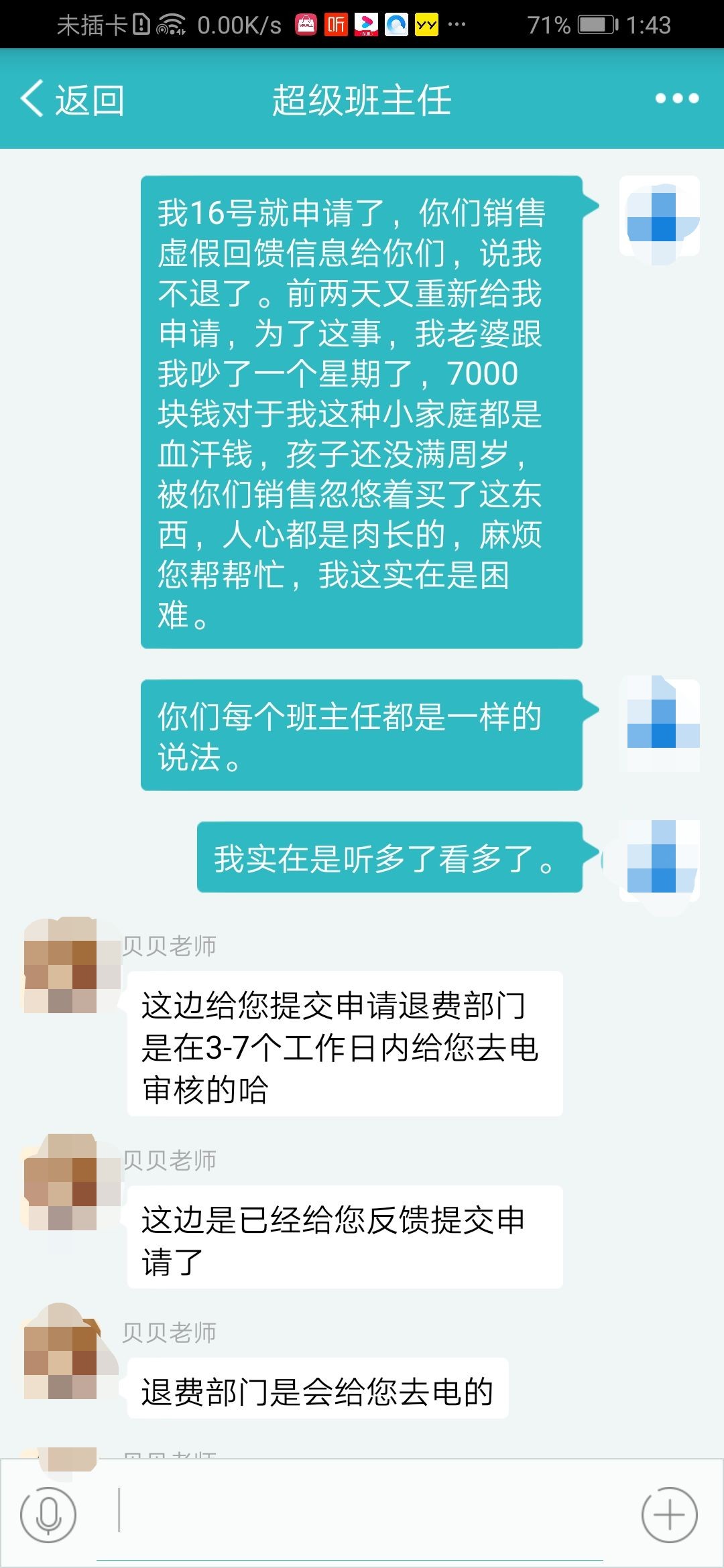 “我曾多次申请退款,嗨学网一直说正在处理,说退费审核人员一般在3-7个工作日内联系我,但我催了好几次,都一直在拖,最后还是我打了12345,嗨学网才联系我的。对方告诉我,由于我看了一小时的课程,根据协议只能退50%的费用。我说自己是因为遭到诱骗才购买课程的,但嗨学网客服称无论我们的销售老师是诱骗你也好或怎样也好,你现在选择了申请退费,就得按照协议要求来,而按照协议,我们无法退全款。”
