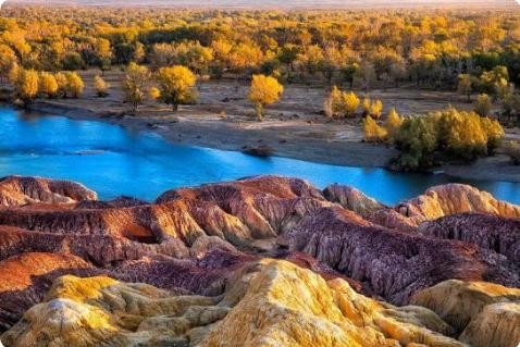 五彩滩又称五彩河岸,是大自然长期的风侵水蚀而形成的地质奇观。五彩滩毗邻碧波荡漾的额尔齐斯河,与对岸葱郁青翠的河谷风光遥相辉映,可谓一河隔两岸,自有两重天。亿万年的地质变迁,将五彩滩的自然风貌雕刻出丰富的纹理,在蓝天白云映衬之下,构成一幅幅多彩的画面。而这画面又随着天气的变化,不断地变换着深浅,如同海底的珊瑚丛,摇曳着一种神秘的生命魅力。