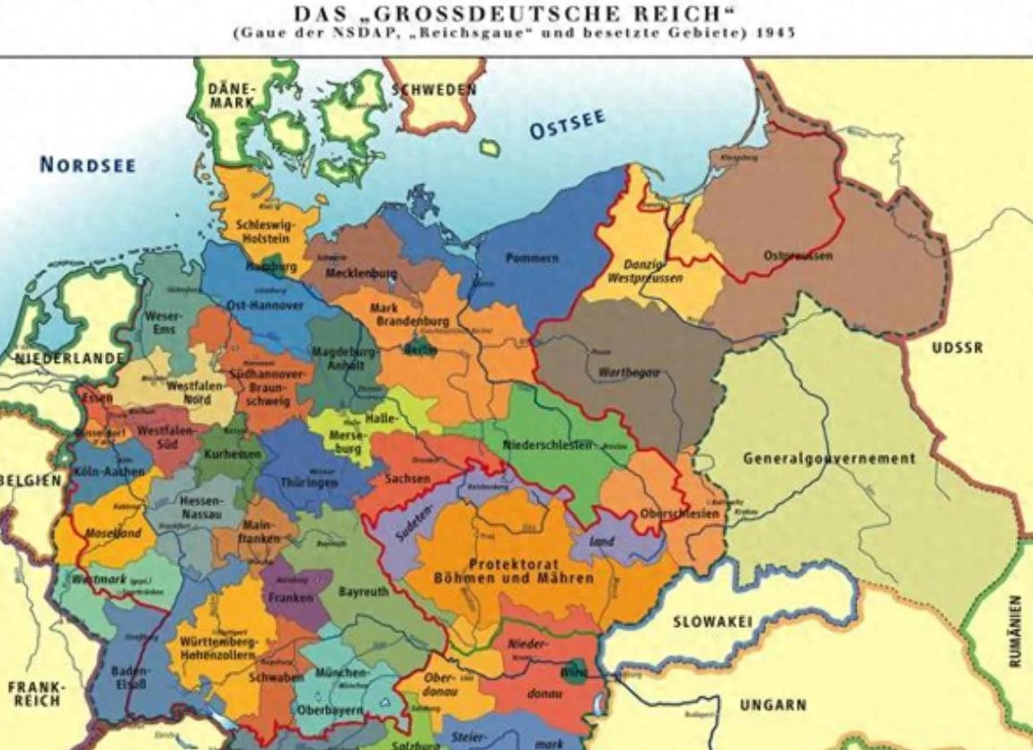 从地图上看,德国的版图在二战时一度扩张到欧洲的半边天,吞并奥地利、捷克斯洛伐克的苏台德地区,再加上后来的波兰、法国、丹麦等地,领土上的人口总数超过两亿。
